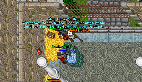 Agora no bestserver temos o NPC Tibia Coins Seller, ele troca gold coins por tibia coins que podem ser usadas para trocar por qualquer coisa da gamestore.